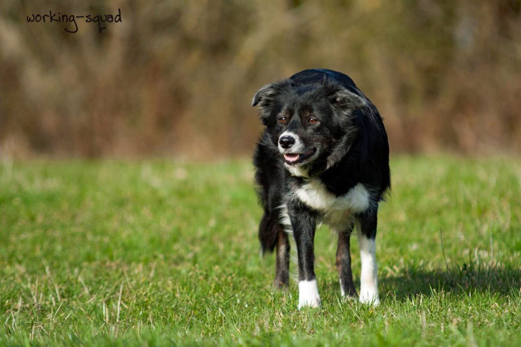 Mit meiner Hündin Sheila reichte dieses System aber nicht aus. Bei ihr beobachtet ich, dass sie, obwohl sie das alles genauso gelernt hatte wie meine anderen Hunde, unwirsch ins Gelände rannte um irgendwann stehen zu bleiben und mich zu fragen, wo es denn überhaupt hingehen sollte. Manchmal machte sie es allerdings perfekt, war absolut orientiert und erledigte die Aufgabe auch auf große Distanzen mit sehr spät sichtbaren Schafen gelassen und ordentlich. Ich begann zu beobachten, wann es schief ging und wann es klappte. Dabei fiel mir auf, dass es meist dann schief ging, wenn Sheila sich das Gelände gar nicht angeschaut hatte. Ich begann mir also die Zeit zu nehmen sie das Gelände betrachten zu lassen. In dem Zuge fiel mir auf, dass meine anderen Hunde das ganz selbstverständlich „nebenher“ machten, vor allem, wenn wir in ein fremdes Gelände gingen. Daher war mir nie aufgefallen, dass das auch ein Teil unseres Orientierungs-Rituals war. Wenn Sheila gestresst vom Umfeld ist, dann starrt sie gerne nur auf mich, um das Drumherum auszublenden. Das ist fast immer der Fall, wenn fremde Menschen drumherum sind. Und dann betrachtet sie das Gelände logischerweise nicht. Nach dieser Erkenntnis begann ich mit ihr gezielt zu üben, dass sie die Umgebung betrachtete. Ich glaube, so mancher Richter hat sich gefragt, warum ich den Hund nicht schickte und so lange da am Pfosten „einfach herumstand“. Das war das Warten aufs Gelände betrachten des Hundes.